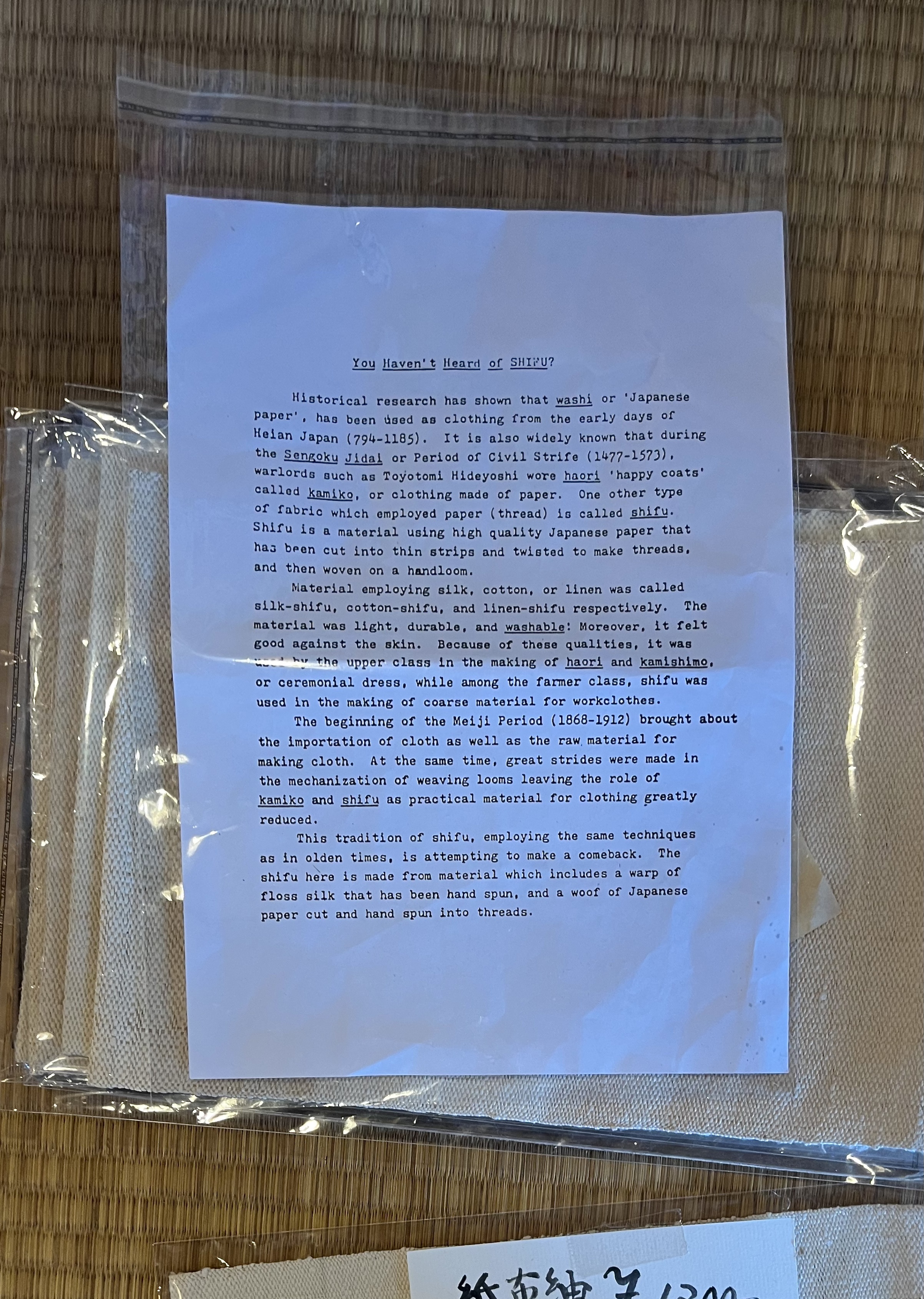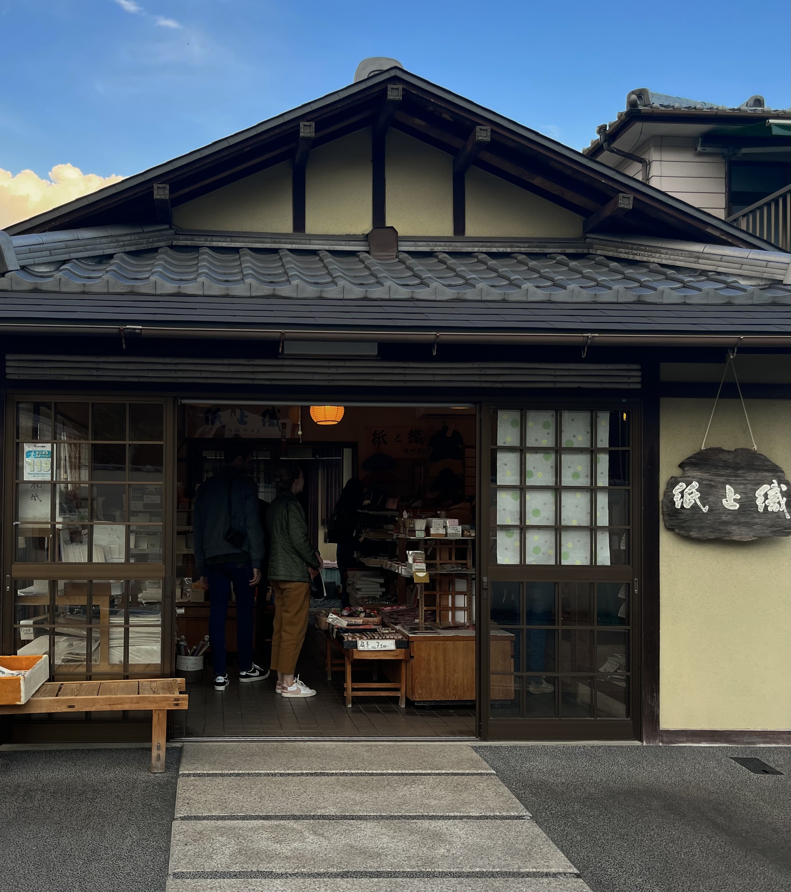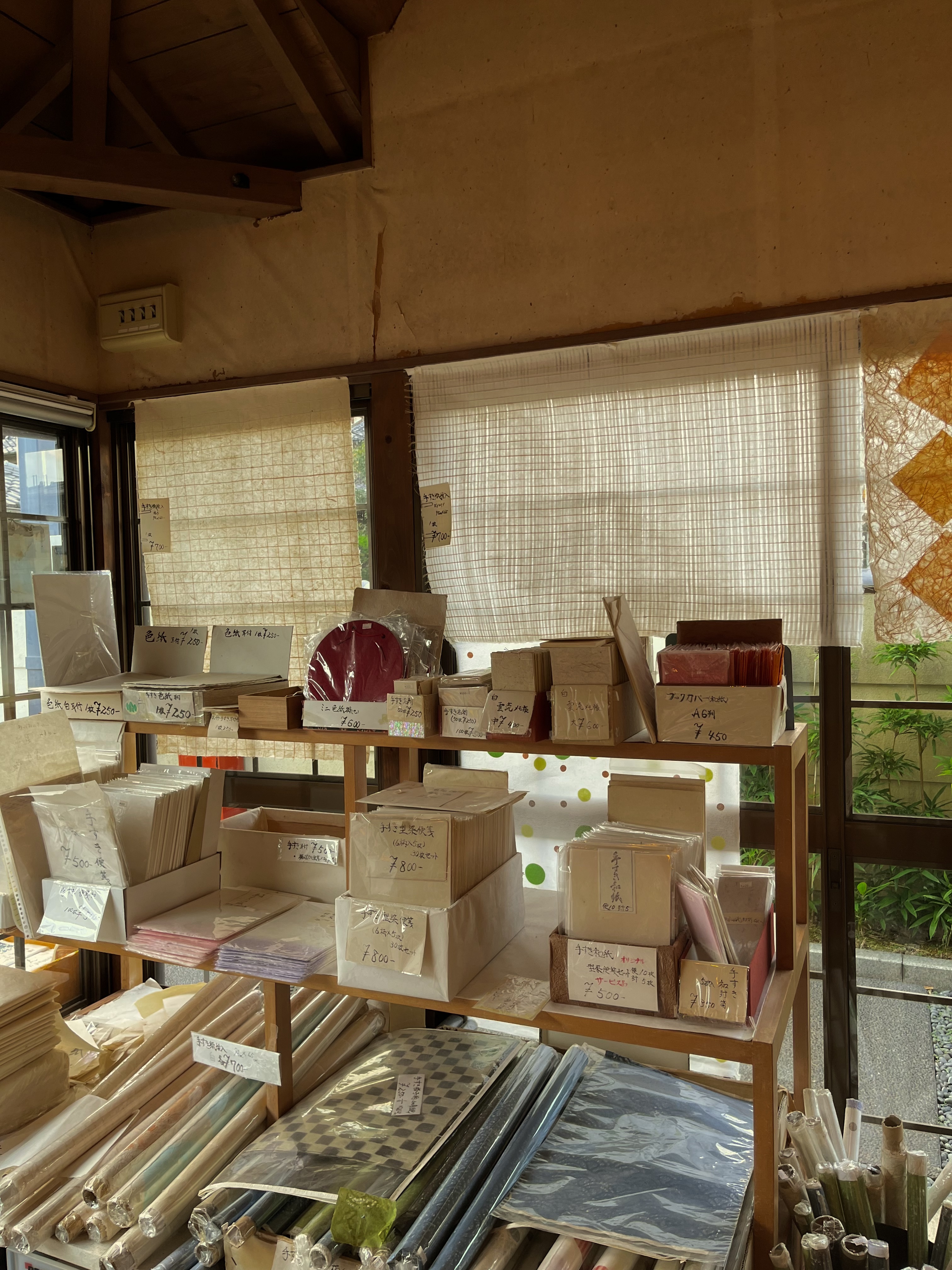 Towards the end of my time in Japan, I visited an old paper store in arashiyama. The elderly woman manning the counter noticed my eyes wondering to the spools of silk hidden in the corner, along with a ziplock pouch of fluffed up cocoons, and a drop spinner poking out of my bag. In an instant she jumped off her stool. And with the brightest beam on her face, she marched right over, poking around my bag and saying a million things that all about resulted into ‘what the hell is this girl doing with these?!?’ I answered as best I could in my broken Japanese and her smile got wider and wider. She grabbed my hands and swung me over to a tiny shelf in the corner. “Do you know what this is?”. It was shifu. Small, decoratively woven fabric with threads made entirely out of paper. Something id only ever heard of in the books back home. She could obviously see the excitement on my face and immediately beckoned me with “Dozo, dozo, dozo”. She walks straight past the growing line of customers, straight out the door, and straight into a huge storeroom full of rolls of paper, and fabrics, and paper fabrics bigger than me. Now starts the obligatory test. A curious point in any direction and a quizzing “kore wa…?”. I finish her sentences and she leads me to my reward. A sharp yank of a swift drawer reveals a treasure trove of fabrics. Mostly shifu, but dyed and decorated in all kinds of ways. The pristine weaves are gorgeous and experimental in some. I ask if it was her who made these, but she bashfully declines and explains how it was rather her son. While I stand there gawking, she rustles around the workshop and pulls out a large roll of washi paper. She hoists it up onto the table and starts to unroll It, and cut. I watch closely as she folds, slices, crushes and twists, all the while she’s rapidly describing her actions in Japanese. She knows I can’t understand at least half of what is being said but it doesn’t matter, the message isn’t one of words this time. At the end of her lesson, we return to the store-front. The line at the counter is going out the back, and my own visiting mum is right at the front of It. She grabs a thread spool, wraps it in a few sheets of washi and a bow. She shoves it into my bag and tells me to get to it. We depart with some kind words and bow our ways apart.